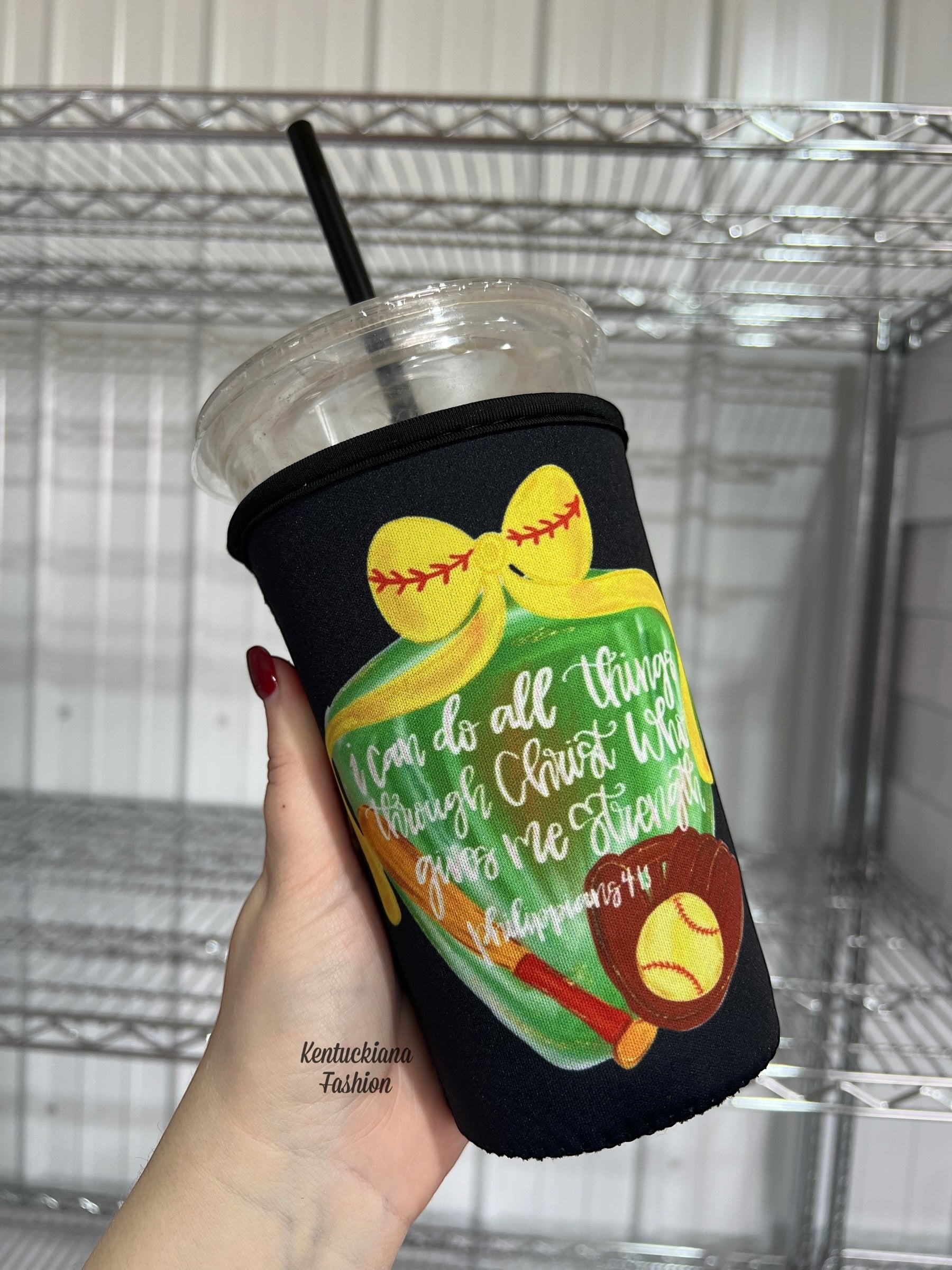 I can do all things through christ softball iced coffee koozie